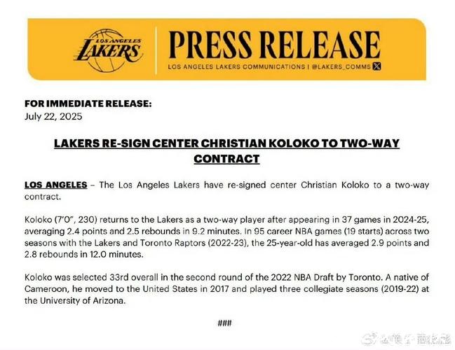 官宣湖人双向合同签7尺中锋 新秀年场均3+3背后的小算盘 当湖人正式官宣用双向合同签下一位身高接近七尺的中锋、而且他的NBA新秀赛季场均数据只是“3分3篮板”时,很多球迷本能地会摇头:这样的球员